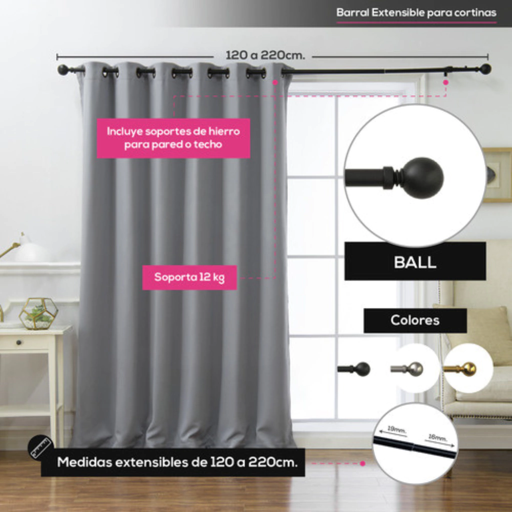 📏 Medidas: Extensible de 120 a 220 cm (sin incluir terminales), adaptable a diferentes anchos de ventana.