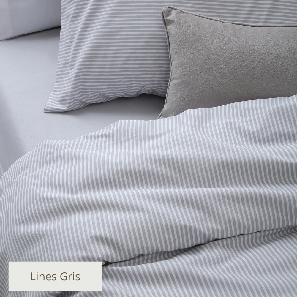 Su diseño combina la sabana ajustable lisa y la sábana plana estampada a rayas, aportando un toque moderno y elegante a tu habitación.